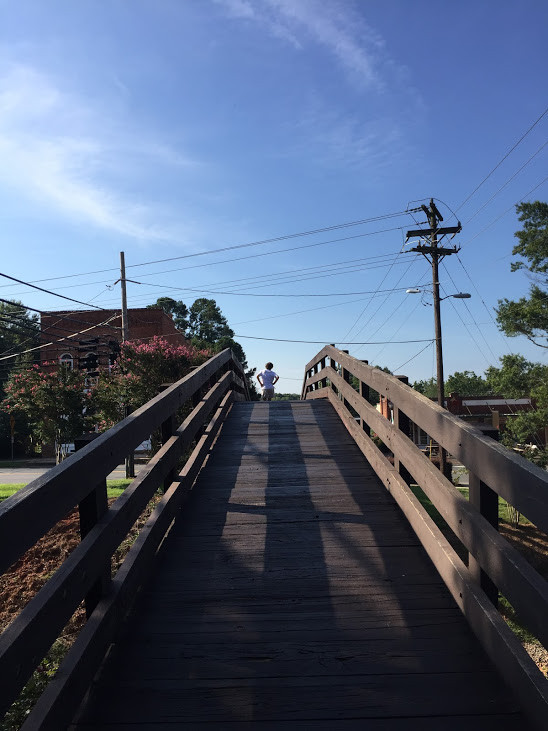 Today, the Carolina Thread Trail travels through the middle of downtown Waxhaw using both sidewalks and greenway plus an over street bridge. "No trip to Waxhaw is complete without a stroll across the historic overhead foot bridge. Once used by automobiles, the bridge is now designated for pedestrian traffic only. Adults and children alike enjoy standing on the bridge while one of Waxhaw's many trains passes beneath their feet. The bridge is flanked on both sides by large shade trees and benches and is located in the heart of historic downtown Waxhaw." Visit Waxhaw website.