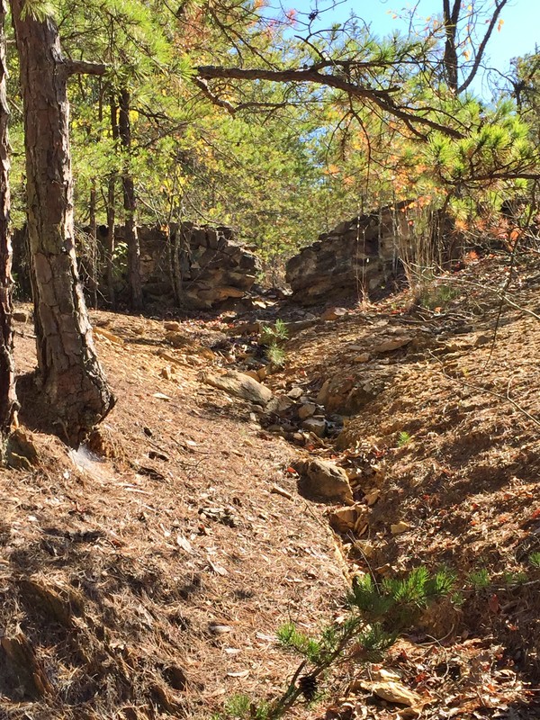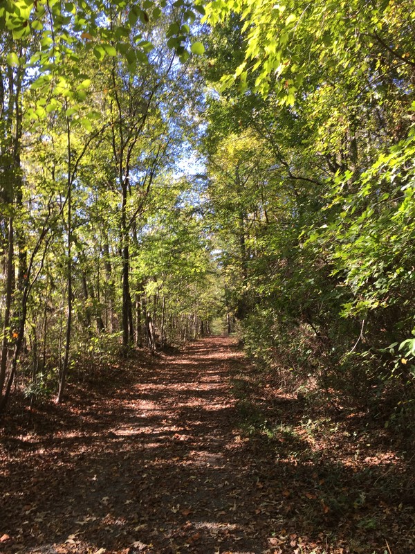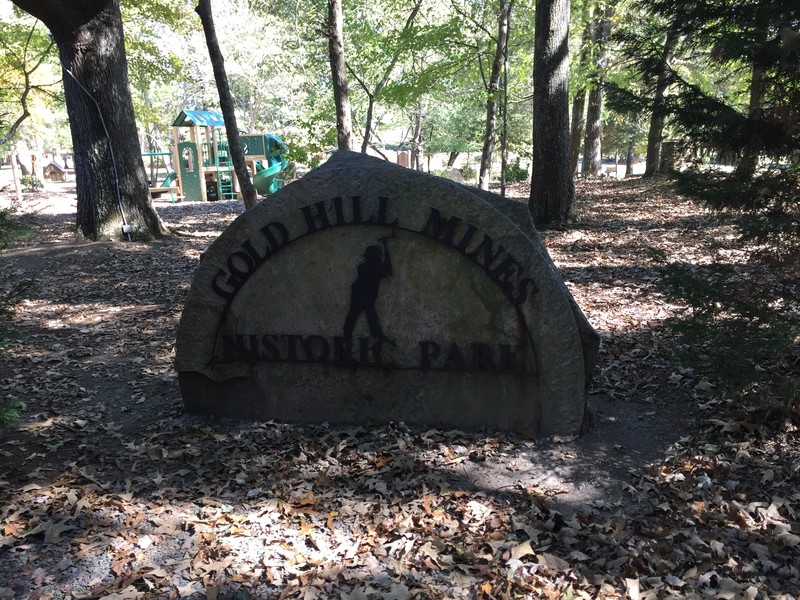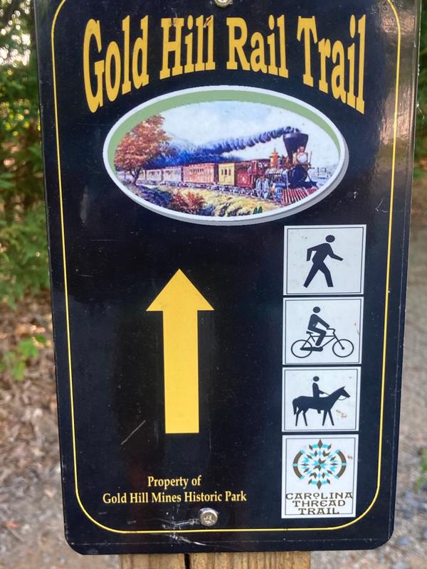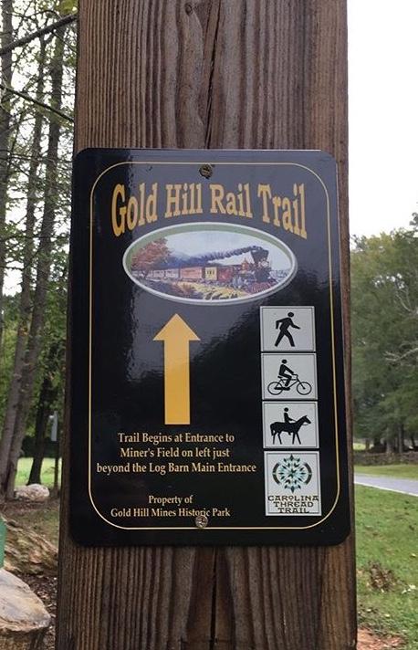 "The Gold Hill Rail Trail is a protected railroad right-of-way developed by the Three Rivers Land Trust in partnership with the Historic Gold Hill and Mines Foundation, Inc. The narrow-gauge rail line was built in the 1880’s to transport gold, gold refining equipment and supplies for the New Gold Hill Ltd. Mining Company. The trail, now owned by the Historic Gold Hill and Mines Foundation, Inc., is a part of Gold Hill Mines Historic Park. It joins other trails developed along the old mining roads throughout the 70-acre park to create a scenic leisurely hiking, walking, jogging and biking trail." Brochure for Annual Gold Rush 5k. To date, the trail ends about a mile from the Cabarrus County line at the site of Union Gold and Copper Co.