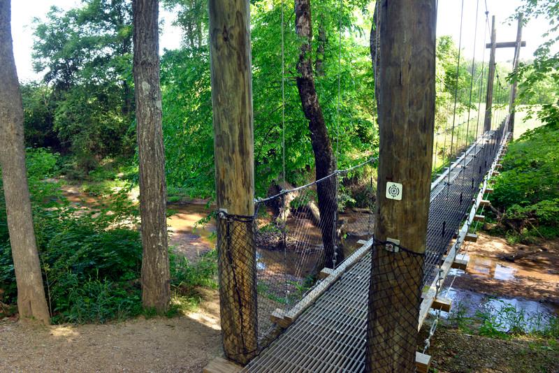 The Buffalo Creek Preserve Trail is located in the town Mount Pleasant, NC in rural Cabarrus County. The trail features a natural surface trail and gravel road overland connector used for walking, hiking, running, and mountain biking. Visitors to Buffalo Creek Preserve Trail will first pass through a restored piedmont oak savanna, followed by a segment along fields where a local farm is growing hay and grains. The trail then enters a young forest and follows along a bluff above Adams Creek, providing a view Mount Pleasant.