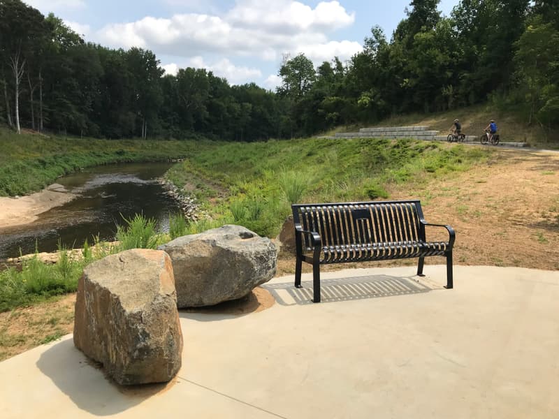 This curvilinear section of Little Sugar Creek Greenway is approximately 2.5 miles in length and provides numerous rest points and overlooks of the riffles in the creek. The 12-ft wide greenway is mostly asphalt but also includes concrete decking on the boardwalks and bridges. The route is bordered by grass shoulders, wooded areas, and wildflowers, as well as the creek itself. Trail users may spot deer in the woods or geese in the creek. Several access trails provide connectivity to surrounding street networks.