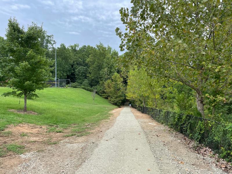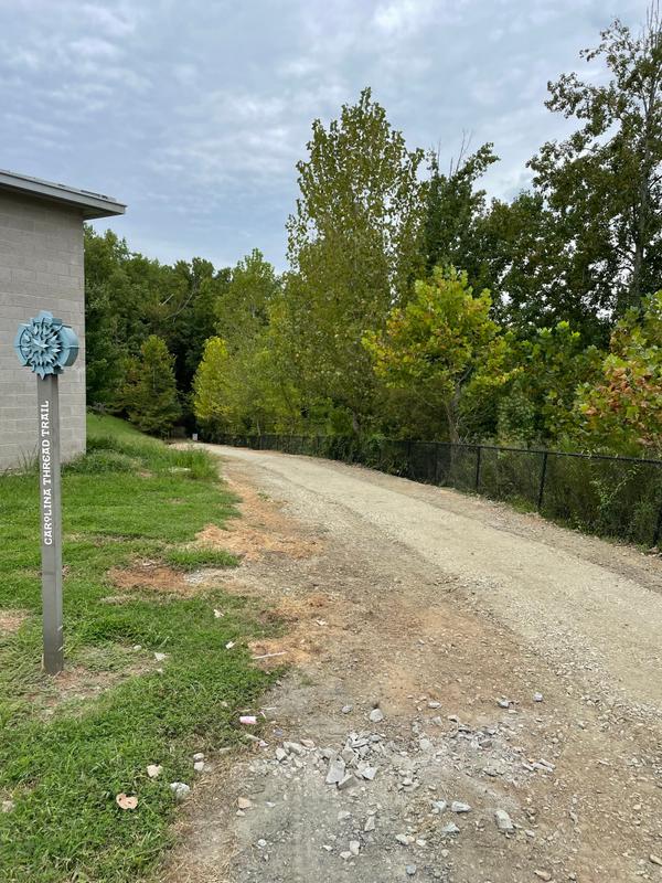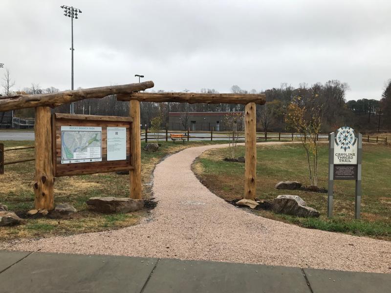The trail is .7 miles long which includes the sidewalk extending to Lakewood Road, and it is well suited for walking and running. The newly updated trail surface is chip-and-seal, providing an easy trail experience for any user. The trail is located on land owned by the Stuart W. Cramer High School, winding behind the high school football stadium and baseball fields. This segment of the Rocky Branch Trail begins on Lakewood Road not far from Goat Island Park in Cramerton, and it transitions into the main stem of the Rocky Branch Trail just below the Stuart W. Cramer High School baseball fields where the trail extends to Belmont or Cramerton at Eagle Road.